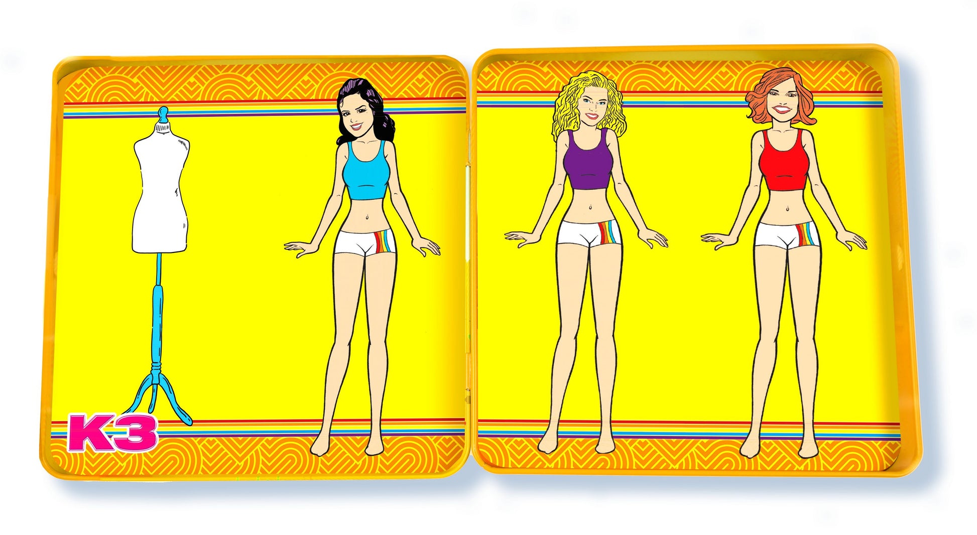 Kleed Hanne, Marthe en Julia aan zoals jij wil! Kies je favoriete kledingstukken, druk ze uit de magneetvellen en geef de K3'tjes een topoutfit. Alles kan handig bewaard blijven in de doos. Dit spel kan eindeloos gespeeld worden en kan je makkelijk overal mee naartoe nemen.
