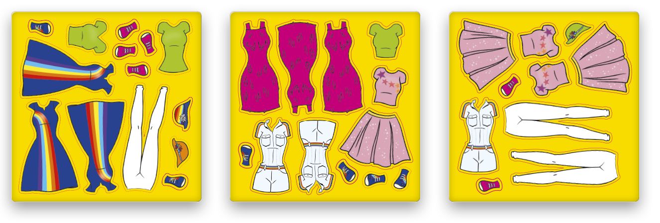 - Uitdrukbare kledingstukken die magnetisch op de figuurtjes geplakt woreden om eindeloos te combineren en opnieuw te gebruiken