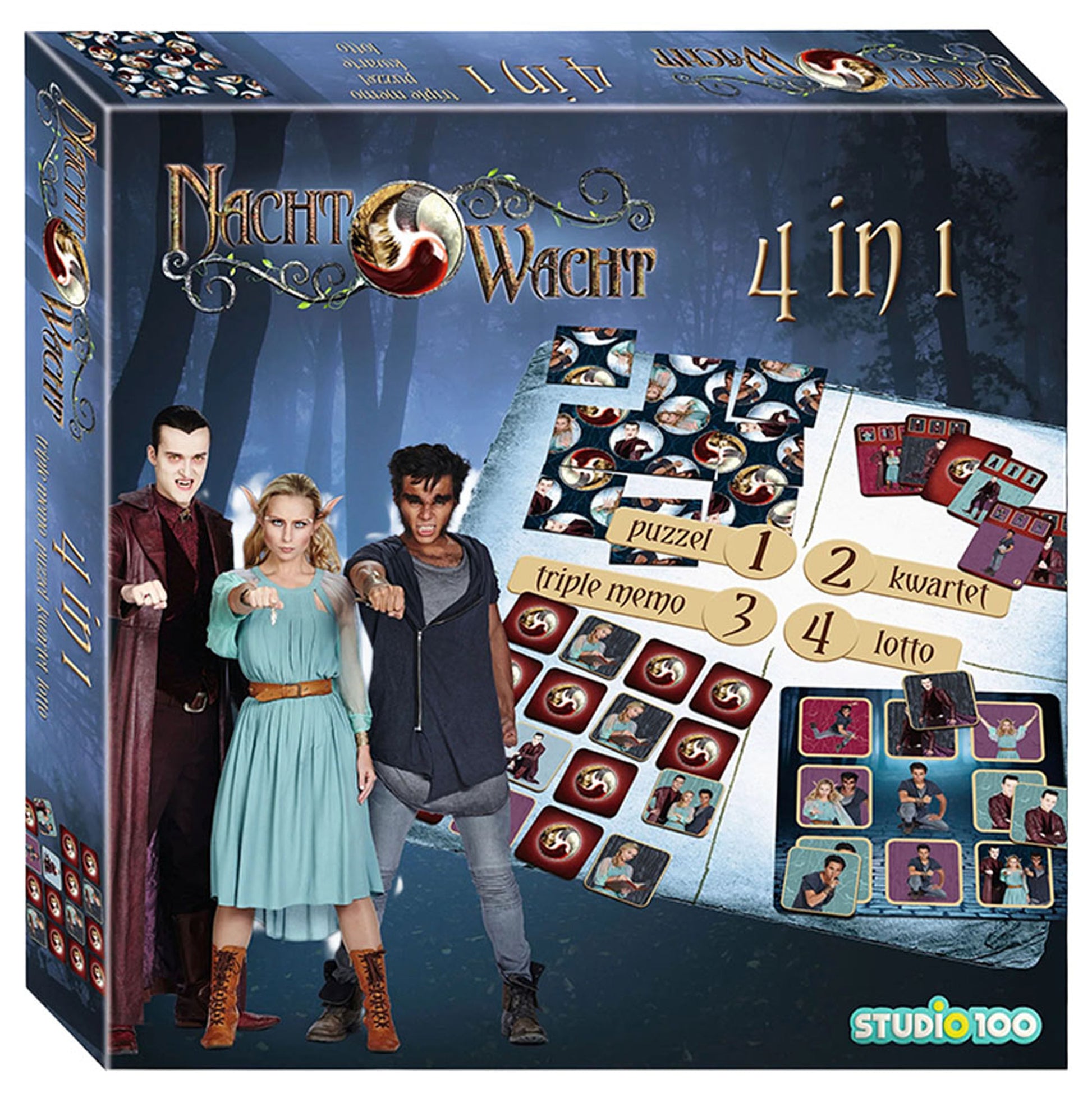 Met deze 4 in 1 speldoos van Nachtwacht zijn uren speelpret verzekerd! Daag je vrienden uit voor een partijtje Triple Memo, ga op zoek naar de juiste kaarten in het Kwartet of probeer als eerste je spaarkaart vol te krijgen in de Nachtwacht Lotto. Kijk goed uit voor het doodshoofd want voor je het weet zijn al je kaartjes weer weg! En als je dan nog niet genoeg kreeg van al dat spelen, leg dan de aartsmoeilijke puzzel die toch maar negen stukken heeft! 4 spellen in 1 doos, dat is 4 keer zoveel pret!