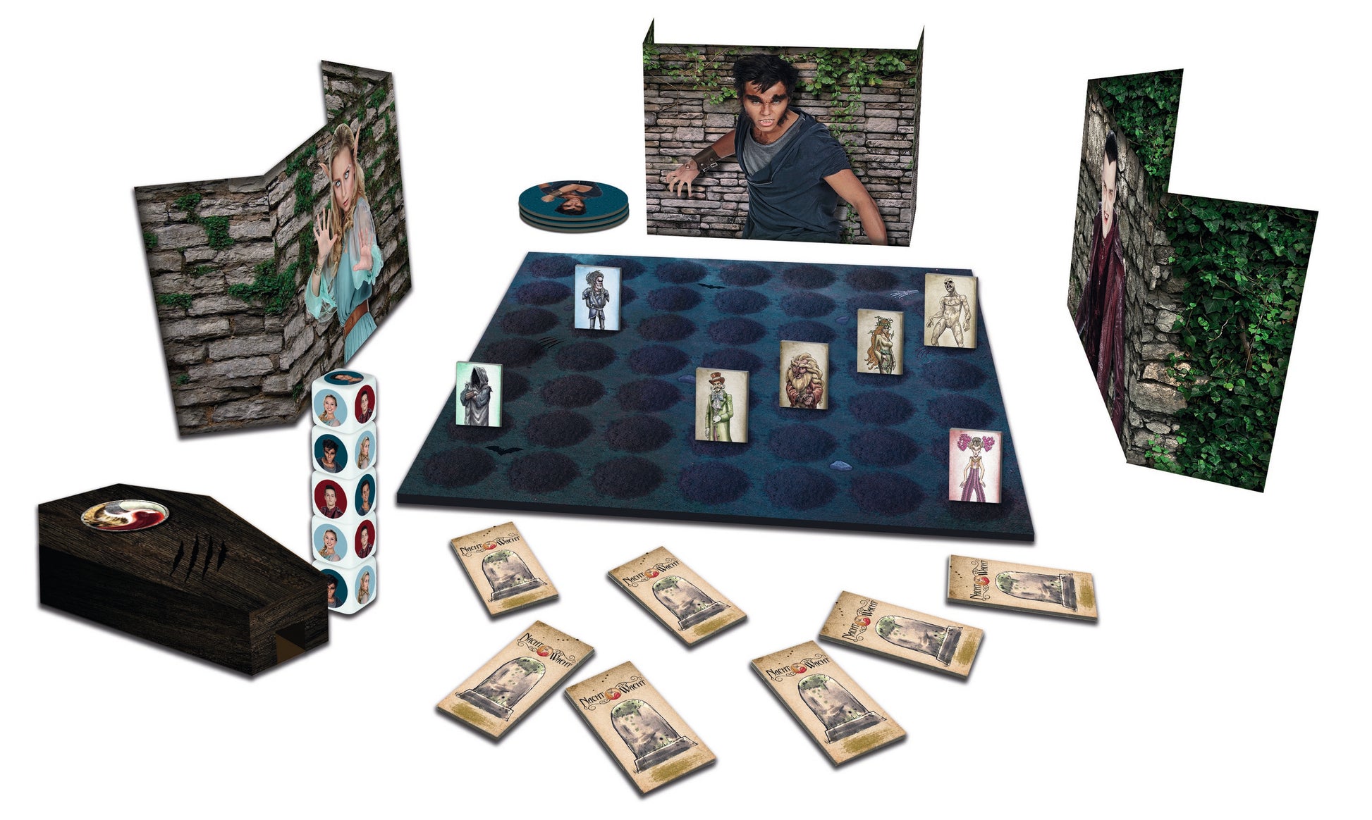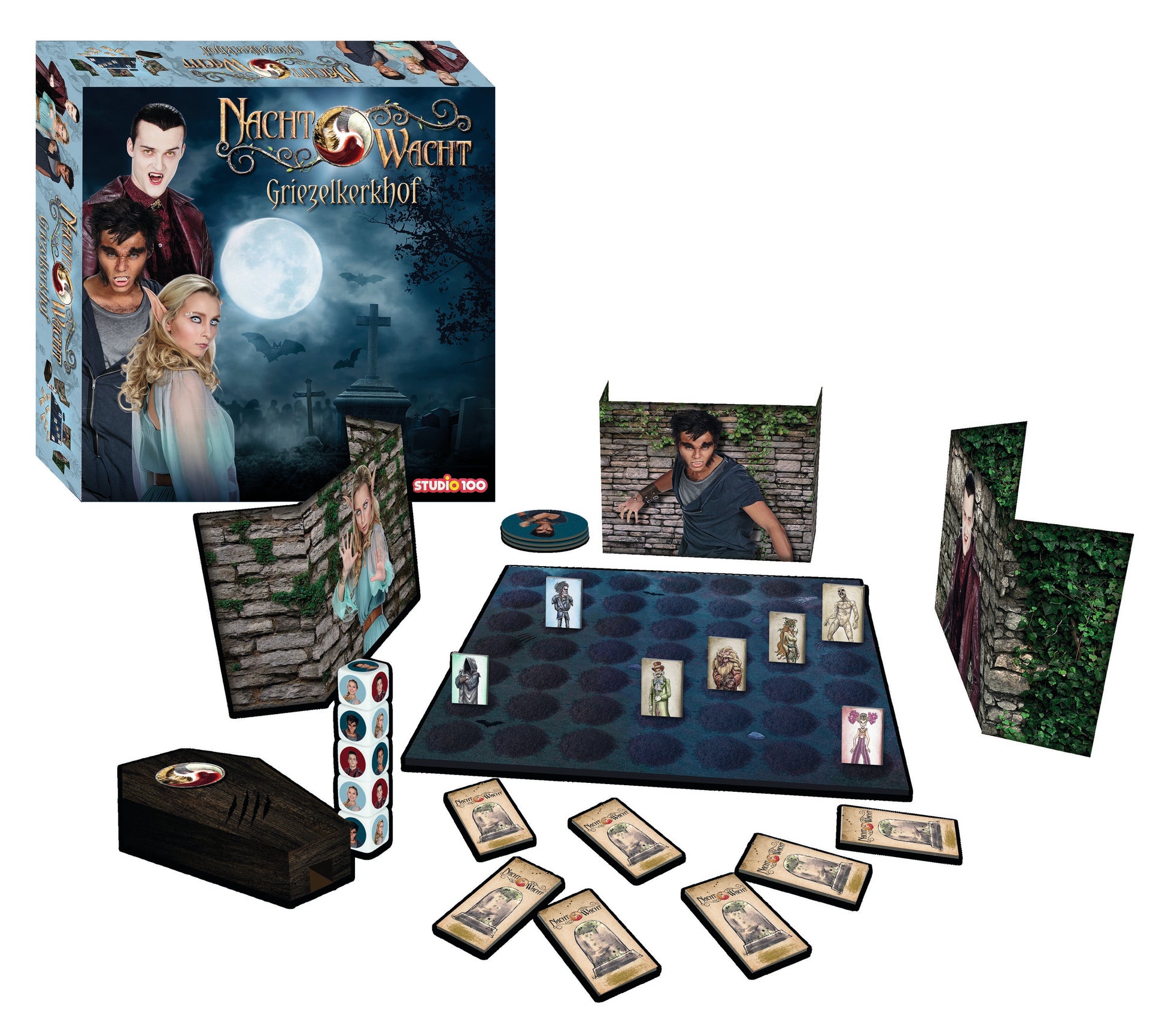 - Verpakkingsinhoud: 1 spelbord, 3 muurtjes, 1 doodskist, 5 dobbelstenen, 80 grafkaartjes, 15 durfkaartjes, spelregels