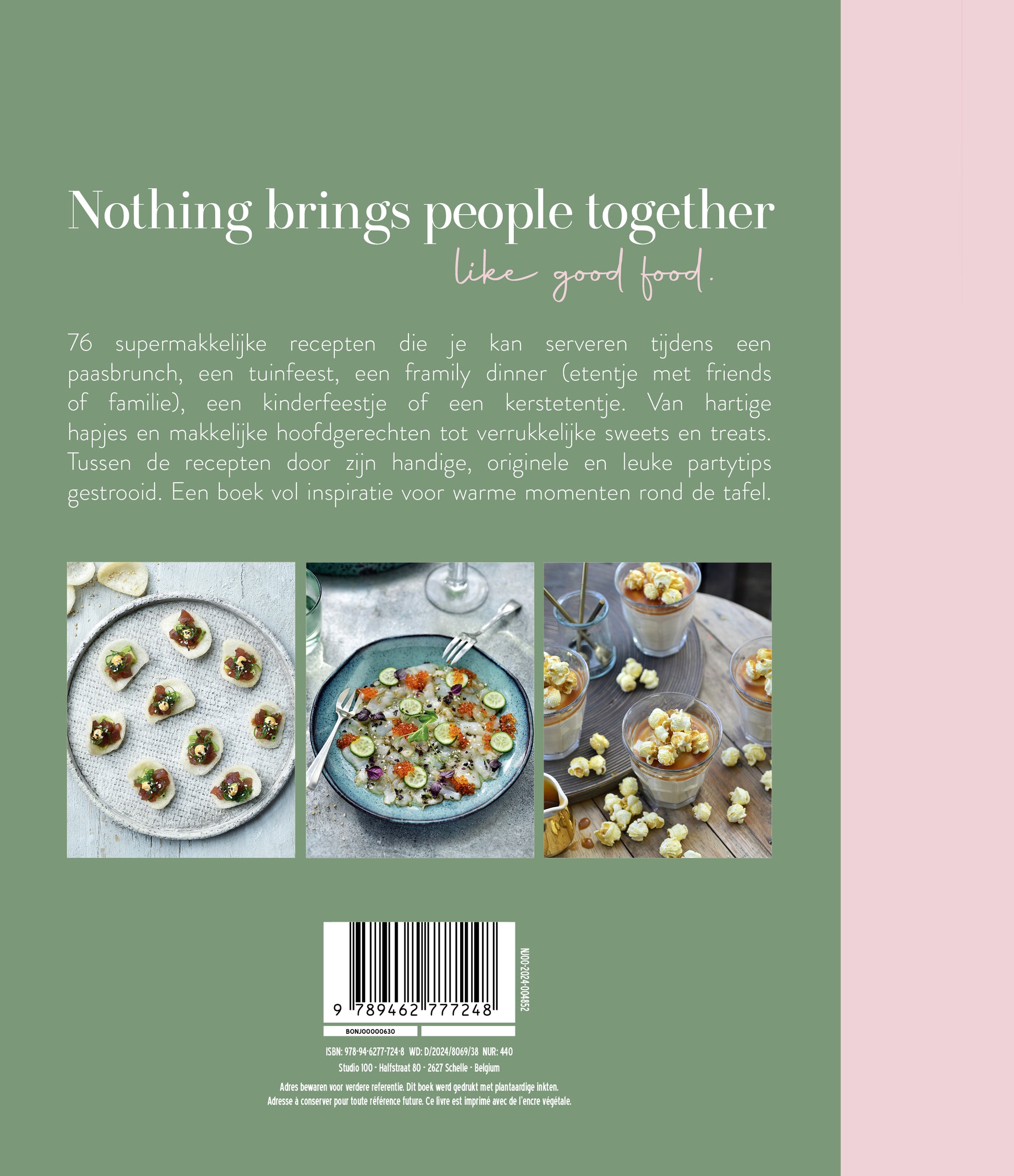 Nothing brings people together like good food. 76 supermakkelijke recepten die je kan serveren tijdens een paasbrunch, een tuinfeest, een framily dinner (etentje met friends of familie), een kinderfeestje of een kerstetentje. Van hartige hapjes en makkelijke hoofdgerechten tot verrukkelijke sweets en treats. Tussen de recepten door zijn handige, originele en leuke partytips gestrooid. Een boek vol inspiratie voor warme momenten rond de tafel.