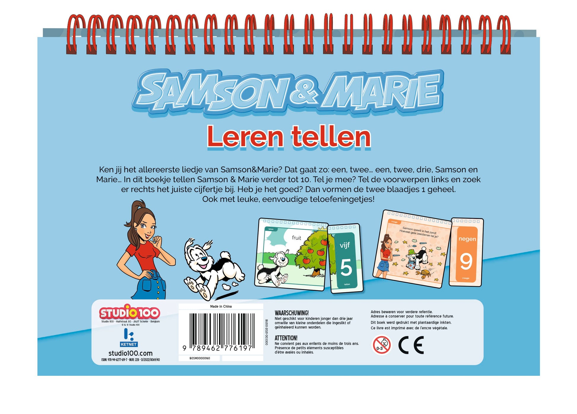 Ken jij het allereerste liedje van Samson & Marie? Dat gaat zo: een, twee… een, twee, drie, Samson en Marie… In dit boekje tellen Samson & Marie verder tot 10. Tel je mee? Tel de voorwerpen links en zoek er rechts het juiste cijfertje bij. Heb je het goed? Dan vormen de twee blaadjes 1 geheel. Ook met leuke, eenvoudige teloefeningetjes!